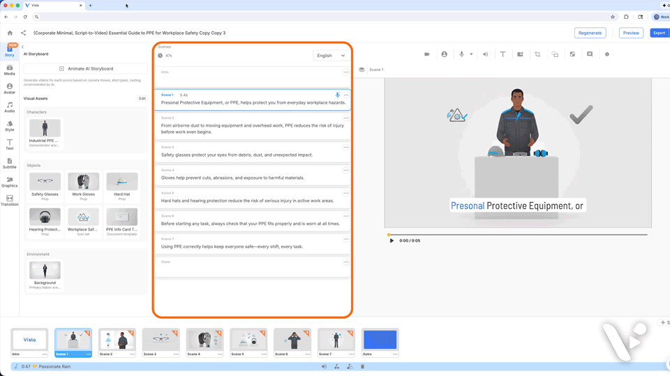 Note: Based on your starting point, Visla may automatically generate characters, objects, and environments for you. These are already set up to be used immediately. However, you don’t have to use them. If they don’t match exactly with your vision, feel free to delete them and generate or upload your own.