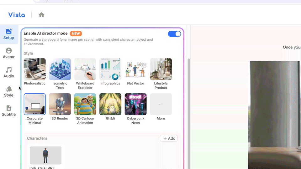 AI Director Mode helps you create cohesive AI videos that stay consistent across multiple scenes, not just one short clip. You start with any input, add your characters, objects, environments, then Visla generates an AI storyboard you can edit. Next, you choose which scenes stay as storyboard images and which ones become full AI video clips.