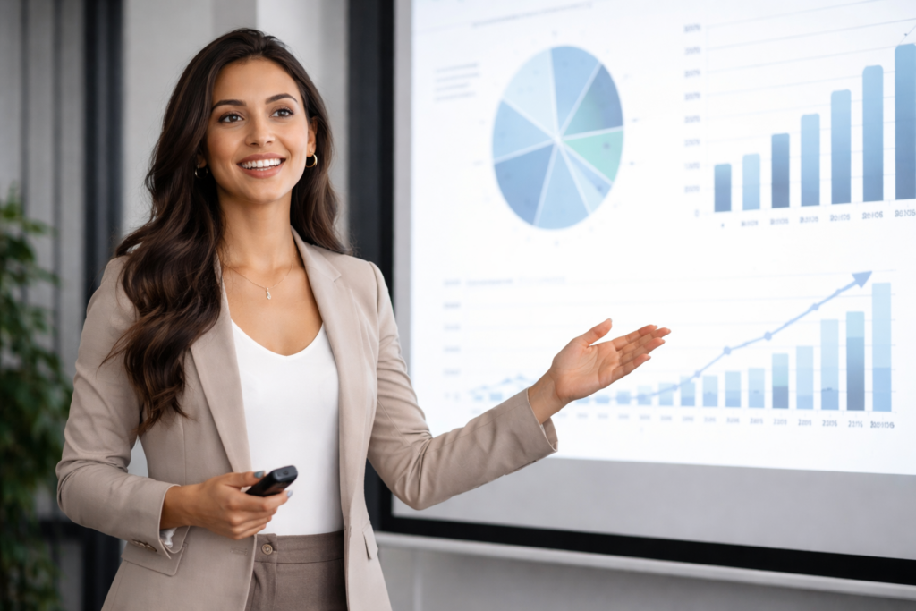 “The camera moves from a medium shot to a close-up while the presenter gestures to the projected screen. Maintain the same person, outfit, and office lighting.”