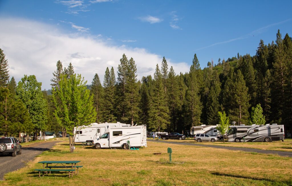 “A large RV drives from the road on the right into an RV park, then parks.”